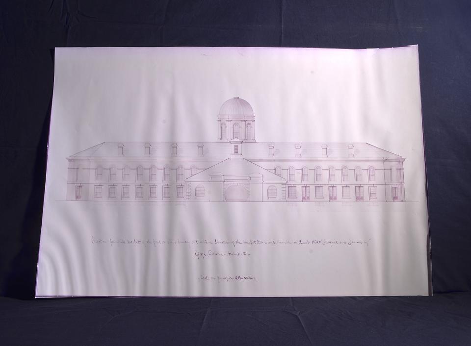 A sepia coloured copy of an original architectural drawing and captioned "Elevation facing the Market of the front or main building and entrance elevation of the Market House and Shambles on Church Street. Designed and drawn by George Browne Architect".
