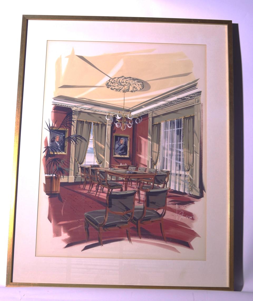 A painting of the John Counter Room in Kingston's City Hall. It is matted and in a gold painted wooden frame. An indistinguishable signature is in the bottom right corner. Painting of the John Counter Room post-1973 renovations. A sticker is adhered with clear tape on the back with "Property of the corporation // of the city of Kingston".