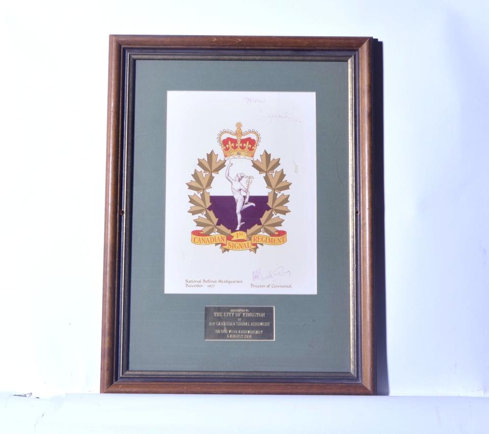 A framed presentation copy of the Coat of Arms of the Canadian 1st Signal Regiment with brass plaque "Presented to the City of Kingston by 1st Canadian Signal Regiment on our 70th Anniversary 6 August 1984". Signed upper right "Approved Elizabeth R" and lower right "J.A. Buckingham" Director of Ceremonial. Set in a green mat and wood frame with gold trim. A white and red label on reverse "Kingston Frameworks ..."