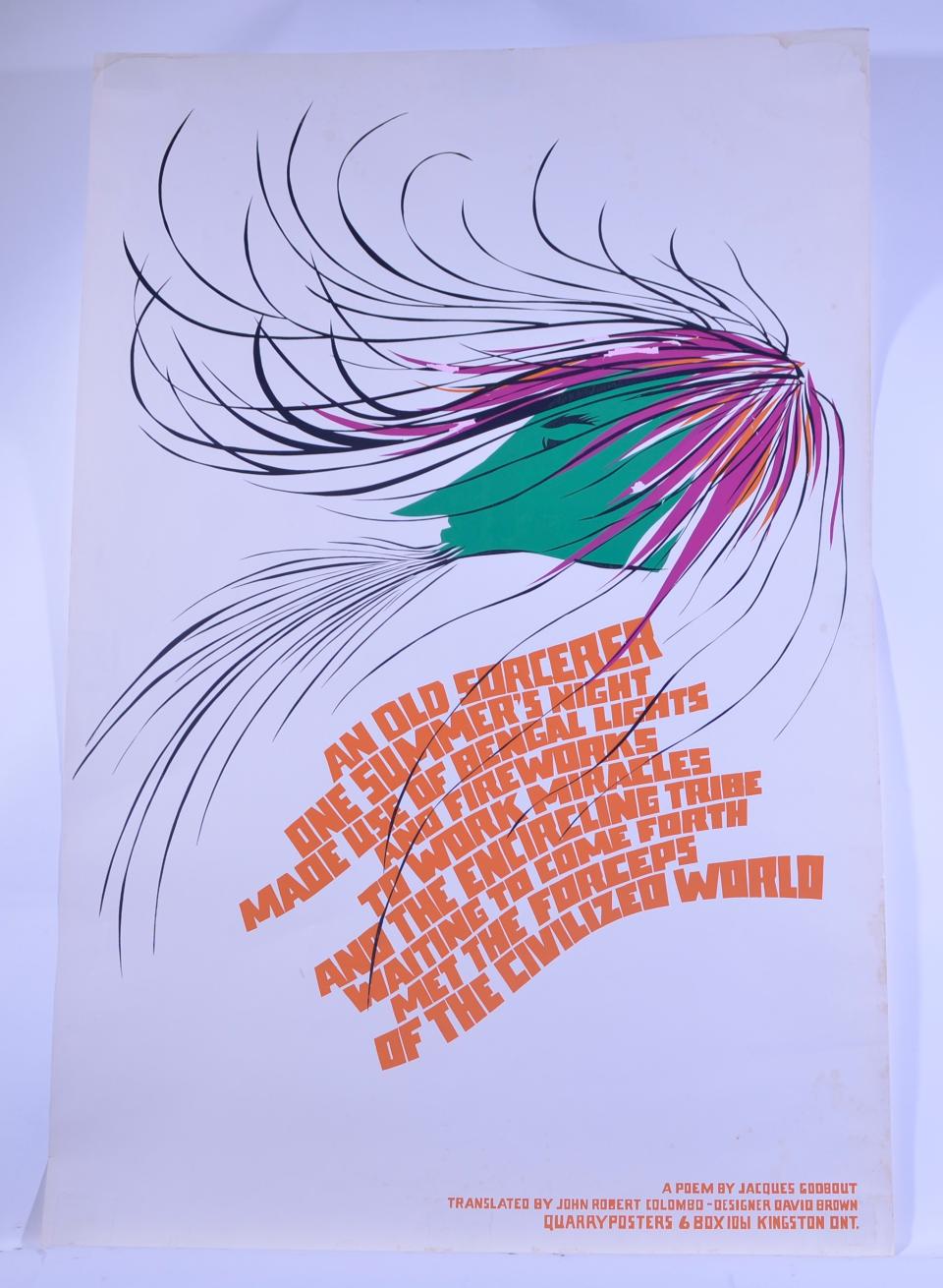 This is a poster of a poem. It has an illustration of a green face in profile with purple, orange and black wispy hair. Under the illustration is a poem in orange text. Below the poem is a caption that says "A POEM BY JACQUES GODBOUT // TRANSLATED BY JOHN ROBERT COLOMBO - DESIGNER DAVID BROWN // QUARRY POSTERS 6 BOX 1061 KINGSTON ONT."