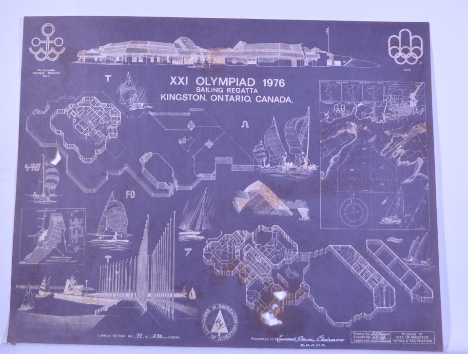 This is a stylized site plan. It contains diagrams of building elevation, and planned views of the redevelopment of Portsmouth Harbour into the Olympic Harbour Park on the occasion of Kingston hosting the 1976 XXI Olympiad Sailing Regatta. It has building plans, illustrations of views around the harbour, a map, and logos. It is printed on paper, with a blue background with white illustrations and text. The upper left corner has the "Portsmouth Olympic Harbour Park" logo, and the upper right corner has the 1976 Olympics Logo. At the bottom is text that reads "Limited Edition No. 71 of 276 Copies", the City Parks and Recreation logo, and the text that says "Presented to Leonard Power, Chairman K.O.P.E.C." There is a small box with the text of who drew the plans, checked them, and approved them, as well as text that reads, "Property of // CITY OF KINGSTON // PARKS & RECREATION".