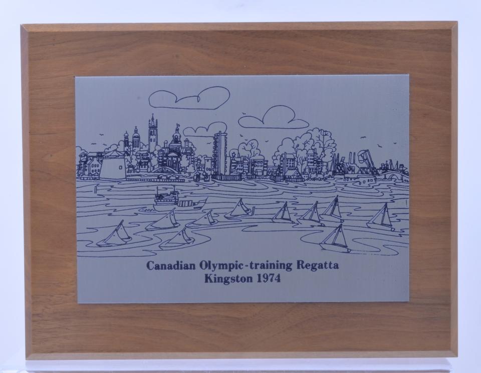 A silver coloured metal plaque that is mounted on a wooden base. The plaque is engraved with an image of Kingston's waterfront with sailboats and a larger ship in the foreground. The background of the image features Kingston's downtown skyline, including buildings like Kingston City Hall and Shoal Tower. The inscription on the bottom of the plaque reads, "Canadian Olympic-training Regatta Kingston 1974". There is a keyhole-shaped opening on both the central top and the central right part of the reverse of the wooden base, for hanging/mounting.