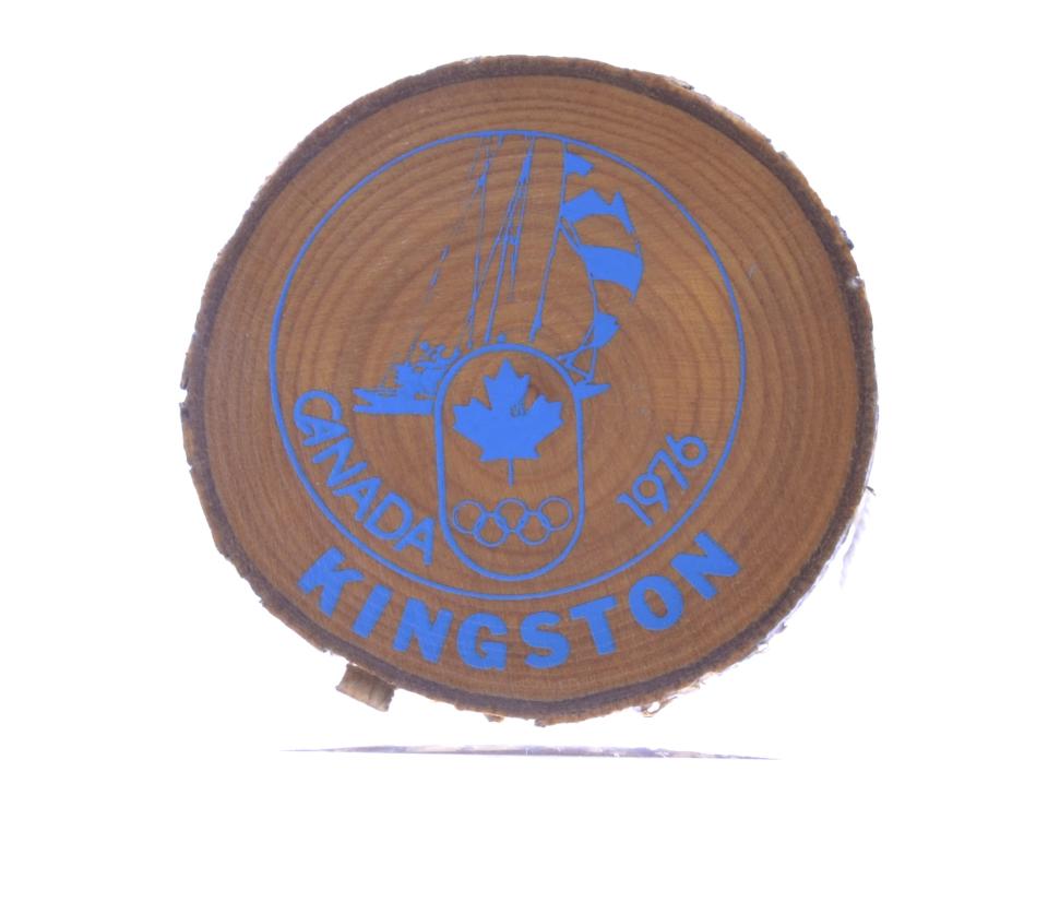 A circular pin made from a disc of wood, in support of Canada's Olympic athletes in 1976. The disc still has bark around the edge, and the wood grain is visible, sealed with a stain or varnish. The design on the front of the pin, stamped or painted in blue, includes a line drawing of a sailboat behind a vertical cartouche with a maple leaf above the Olympic rings, and with "CANADA" and "1976" on either side. There is a circular border around the design, with the word "KINGSTON" below. The back has "Support Canadian Athletes" and a maple leaf underneath stamped in black.