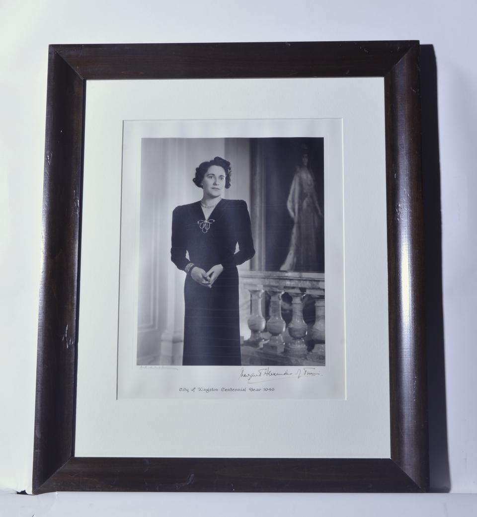 This is a framed black-and-white photograph of Margaret Alexander of Tunis, Viscountess. She is standing in a dark dress and wearing diamond jewelery in an interior space. A title on the bottom of the photograph reads, "City of Kingston Centennial Year 1946". There is Margaret Alexander of Tunis' signature on the bottom right of the photo. The photograph has a wooden frame with a glass front. It has a plastic backing and a hanging wire. Inside the plastic backing is a paper board with hand-written notes that read "Presented by J. Stuart Crawford Mayor 1946-1948."