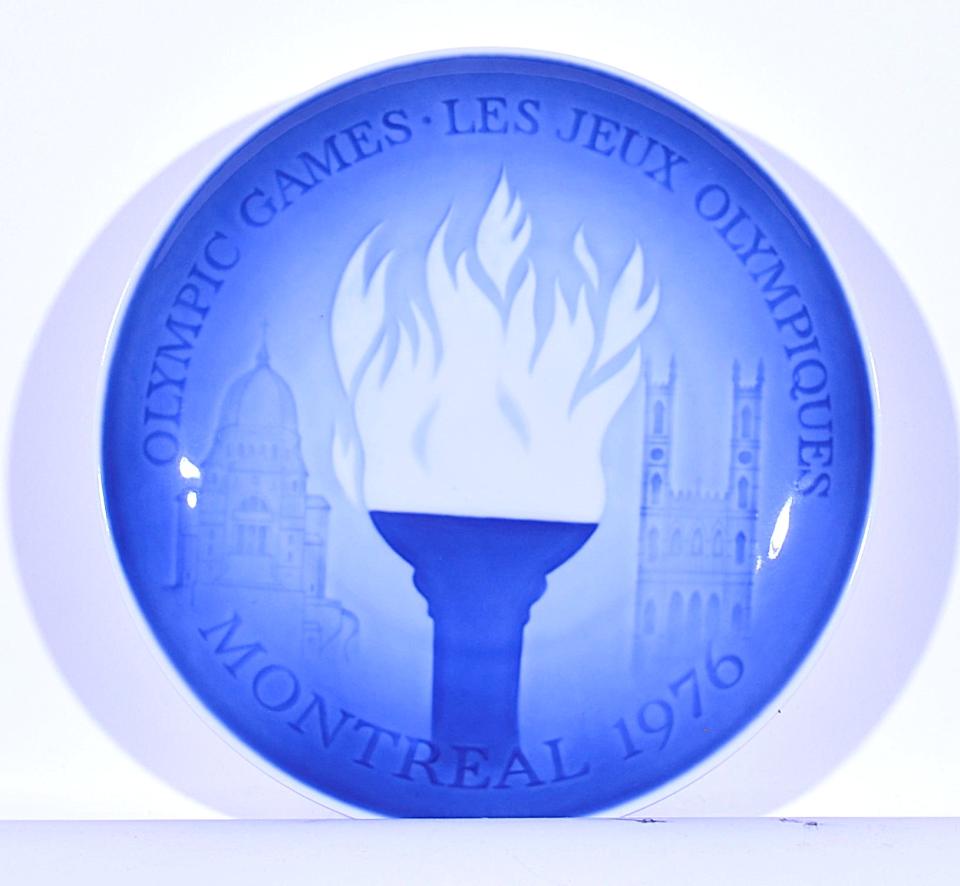 This plate was one of at least two different designs of commemorative plates for the 1976 Montreal Olympics. It includes illustrations of two Montreal landmarks: Saint Joseph’s Oratory of Mount Royal on the left, and Notre-Dame Basilica on the right. Another plate depicted a discus thrower with the world in the background above the Montreal Olympic logo.
