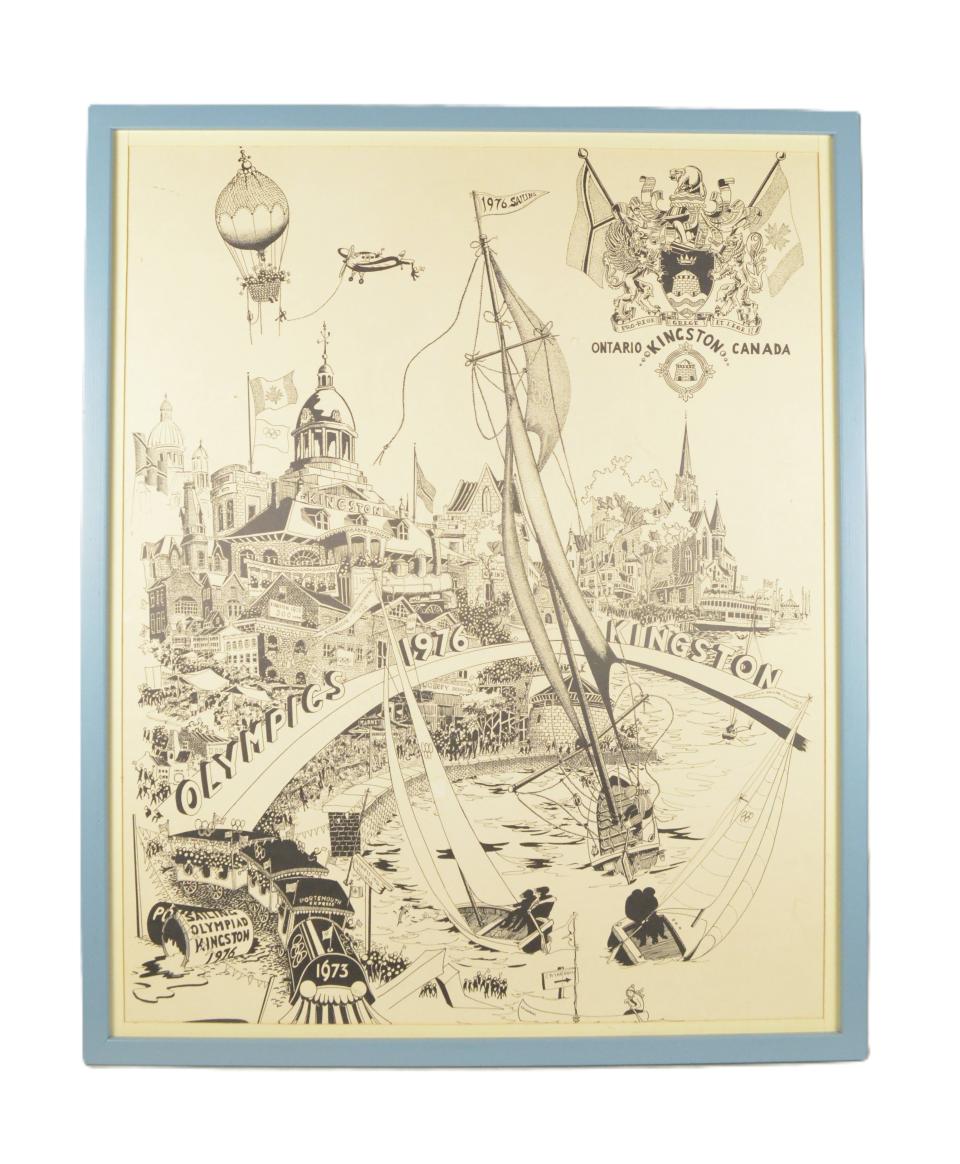 A print by Fred Schonberger commemorating the 1976 Summer Olympic sailing events that were held in Kingston, Ontario. The print features multiple scenes and Kingston locations. In the foreground is a train engine with cars that has "16/973" on the front and Canadian flags and the Olympic rings on the roof with "PORTSMOUTH // EXPRESS" above the first car. In the bottom left corner is the public art sculpture by Yvon Cozic titled "Pollution", which is the arrangement of large tubes with "PO // SAILING OLYMPIAD KINGSTON 1976" written on them, the sculpture is located in Macdonald Park. To the right of the train is another public art sculpture titled "Time" by Kosso Eloul which is a two-piece unconnected metal arrangement that is located in Breakwater Park. There are multiple sailing ships on the St. Lawrence River in the foreground that are flying flags that read "KINGSTON - MONTREAL '76", "KINGSTON SAILING OLYMPICS '76" and "1976 SAILING". City Hall is in the mid-ground and is surrounded by market stalls and crowds of people. There is a banner in the mid-ground in front of City Hall that extends the whole width of the sketch that has "OLYMPICS 1976 KINGSTON" on it in block letters. In the top right corner is the Arms of the Corporation of the City of Kingston. There is a hot air balloon and a prop plane in the top left corner. The print is adhered to a wood backing by beige matting that is around the perimeter of the print and is housed in a wood frame that has been painted blue. There are two eyelet screws on the back of the frame and a grey coloured cord used for hanging the print.