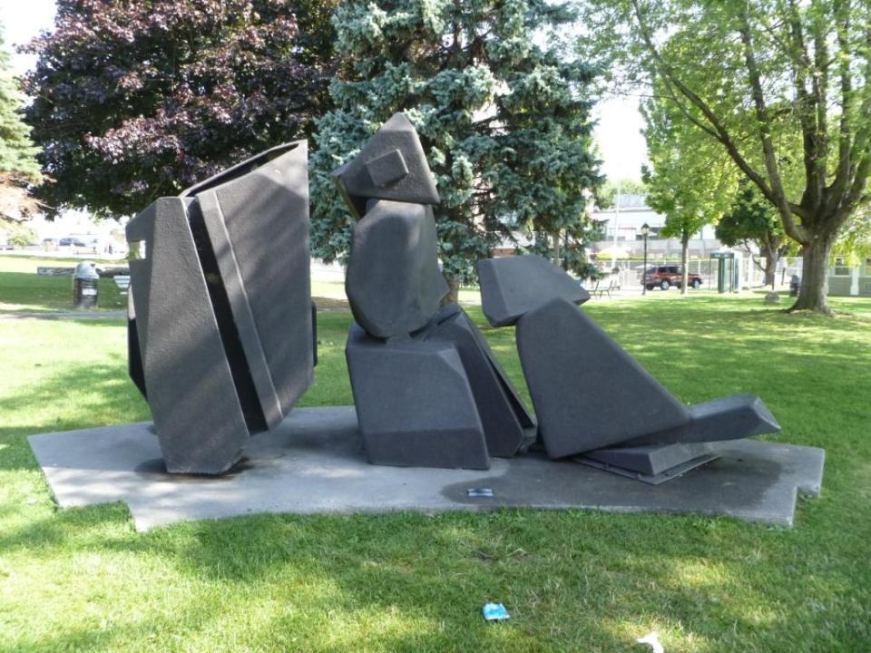 Sculpture entitled "Staking Shapes" by Walter Redinger. Abstract, large-scale sculpture comprised of three sections. Made of molded fiberglass painted black with a rough, pebbly surface texture. Sits on a purpose-made concrete base.