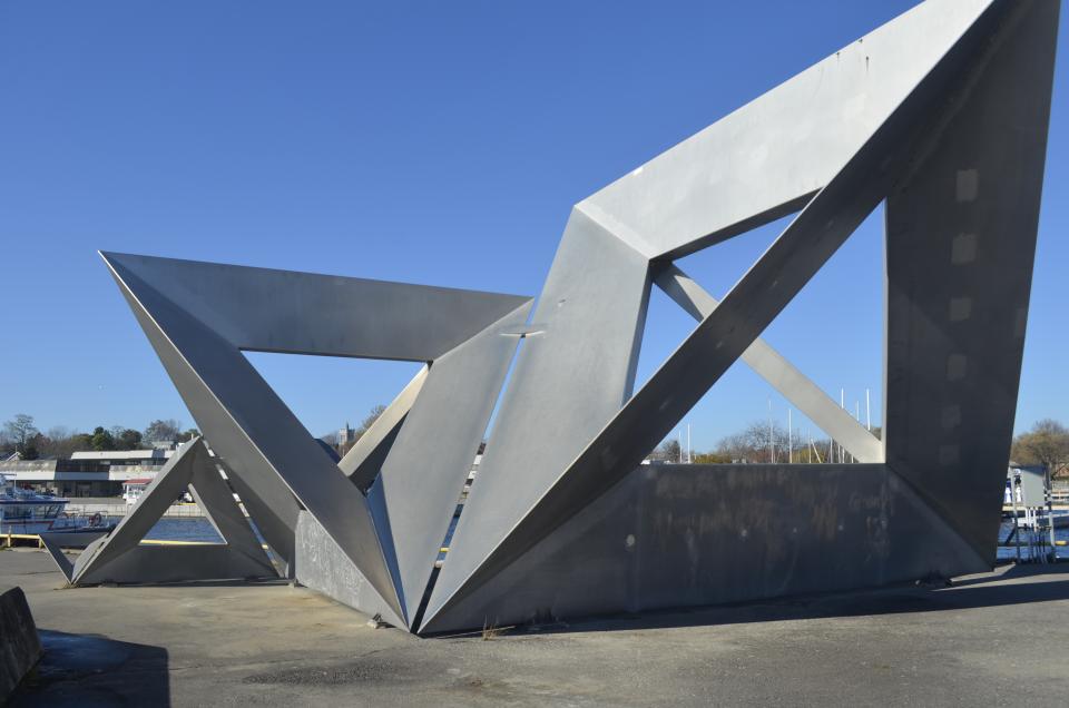 Large-scale metal sculpture made by Artist Ted Bieler in 1976, comprising 4 tetrahedron shapes/modules ranging from small to very large. They are arranged in ascending order and are attached to each other by welded metal linkages. Sculpture is welded metal; bolted to cement wharf.