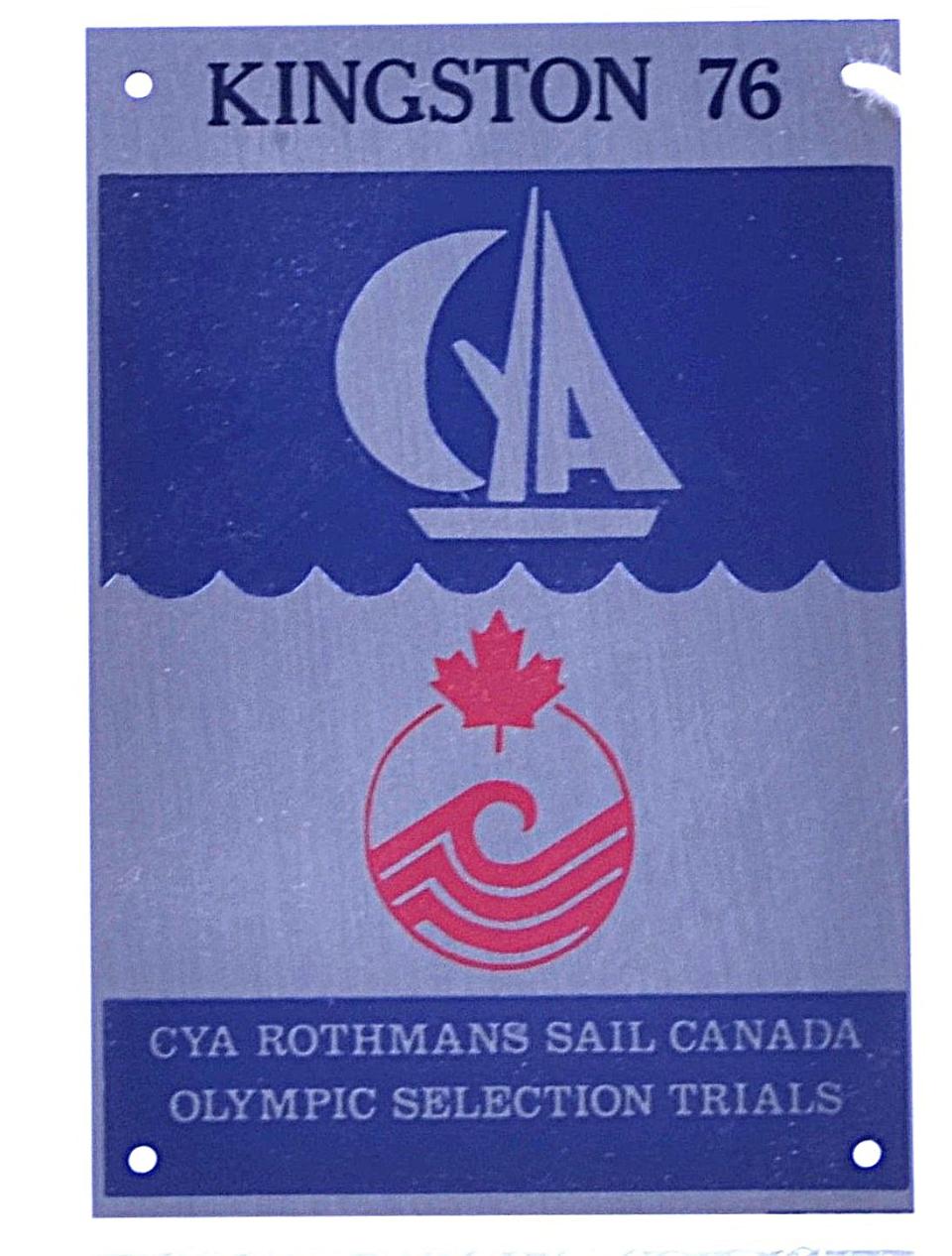 Rectangular metal sailing plaque for the selection trials for the Olympic games. The top half of the plaque features "KINGSTON 76" in blue text on a grey background across the top, above the stylized CYA (Canadian Yachting Association) logo in the shape of a sailboat in grey on a blue background with a wave motif along the bottom. The bottom half of the plaque has a grey background with a red logo featuring a wave within a circle with a maple leaf at the top. Below the logo in grey text on blue background is "CYA ROTHMANS SAIL CANADA/ OLYMPIC SELECTION TRIALS". There is a small hole in each corner of the plaque.
